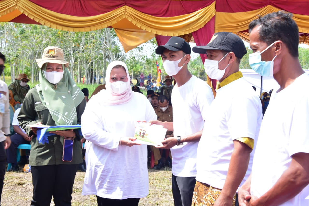 SIAK KECIL – Bupati Bengkalis Kasmarni melaksanakan panen raya padi bersama masyarakat di Lahan Demplot Sekolah Lapangan dan pembagian Kartu Tani Gabungan Kelompok Tani Tanjung Permai, Senin (31/1/2022) bertempat di Jalan Usaha Tani Dusun Penamai Desa Tanjung Belit Kecamatan Siak Kecil.