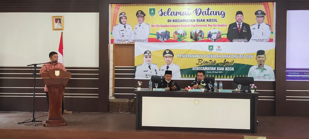 SIAK KECIL - Badan Amil Zakat Nasional Kabupaten Bengkalis kembali menaja bimtek Amil dan Penyerahan Tas Sekolah Anak Dhu'afa Sekecamatan Siak Kecil yang di ikuti sebanyak 51 peserta,dilaksana pada kamis, 08 april 2021 di Gedung Ismail Yusuf Kantor Camat Siak Kecil.